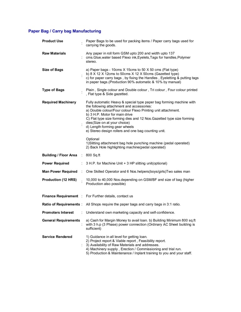 Paper bag manufacturing project report pdf. This article includes a sample paper bag making business project report profile with How To guide. In many countries now especially the United States shoppers at local super markets and retail chains offer their customers the option to have their products bagged in plastic or paper. The project report includes a detailed descriptions of the production of the bags the materials that we will be requiring how we are going to go about the manufacturing process a detailed description of the personnel planning how we are going to train our employees and how we are going to recruit the employees and the financials.