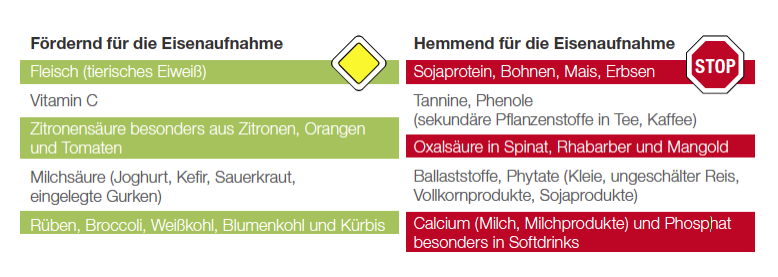 Stark hemmend wirken sich. Meist ist das Eisen an andere Stoffe gebunden die die Aufnahme hemmen wie zB. Verhindern lässt sich dies durch Kombination der Magnesium-Einnahme mit einem niedrig dosierten Gemisch aus Mineralstoffen und Spurenelementen. In der normalen Kost sind Förderer und Hemmer der Eisenaufnahme enthalten 42. Kaffee Tee Milch und Kakao Cola oder auch Rotwein hemmen die Eisenaufnahme. Das kann eine chronisch Störung der Blutbildung zur Folge haben. Vitamin C steigert die Eisenaufnahme aus der Nahrung.